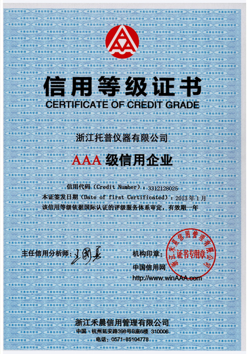 熱烈祝賀浙江托普儀器有限公司在2013年1月獲得AAA級信用企業稱號。
