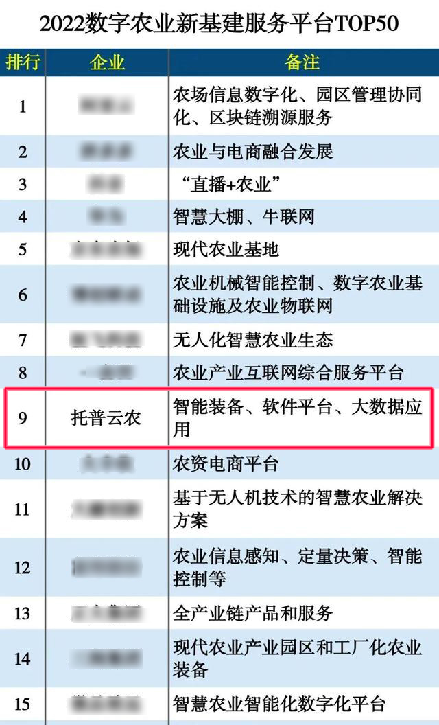 近日,由中國(guó)科學(xué)院《互聯(lián)網(wǎng)周刊》等權(quán)威機(jī)構(gòu)聯(lián)合評(píng)選的2022數(shù)字農(nóng)業(yè)新基建服務(wù)平臺(tái)TOP50榜單重磅發(fā)布,浙江托普云農(nóng)科技股份有限公司憑借智能裝備、軟件平臺(tái)、大數(shù)據(jù)應(yīng)用的綜合優(yōu)勢(shì),位列第9名。一同入選榜單的企業(yè)有阿里云、拼多多、華為、京東、大疆等。