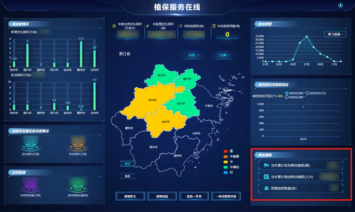 “浙江植保服務在線平臺”匯集全省11個地市農(nóng)業(yè)生產(chǎn)種植、專業(yè)合作社、植保服務組織等基礎信息。平臺通過采集布設在各地市的監(jiān)測點數(shù)據(jù),對害蟲信息進行動態(tài)展示和對比分析,并聯(lián)動水文、氣象等進行綜合研判、智能預警,及時發(fā)現(xiàn)遷入時間、發(fā)生峰值,有效開展統(tǒng)防統(tǒng)治,避免重大病蟲害暴發(fā)成災,最后,還會對整個防控過程進行服務反饋,確保應防盡防應治盡治,實現(xiàn)了植保工作的閉環(huán)管理。