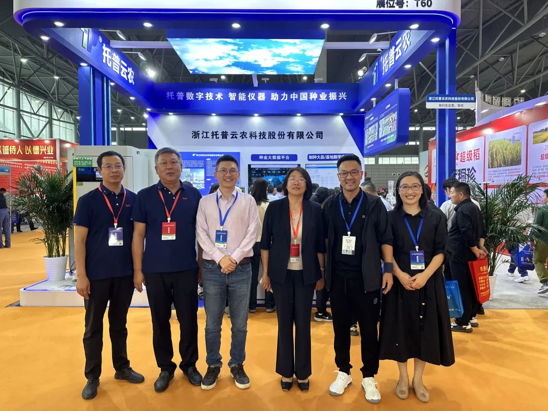 全國農技中心副主任劉信(右四),全國農技中心品種登記處處長邱軍(右三),全國農技中心種子檢驗處處長金石橋(左三),全國農技中心種業監測處處長張力科(右一),全國農技中心種子檢驗處副處長晉芳(右二),全國農技中心區試處副處長曾波(左二),全國農技中心農藝師馬文慧(左一)蒞臨托普云農展位