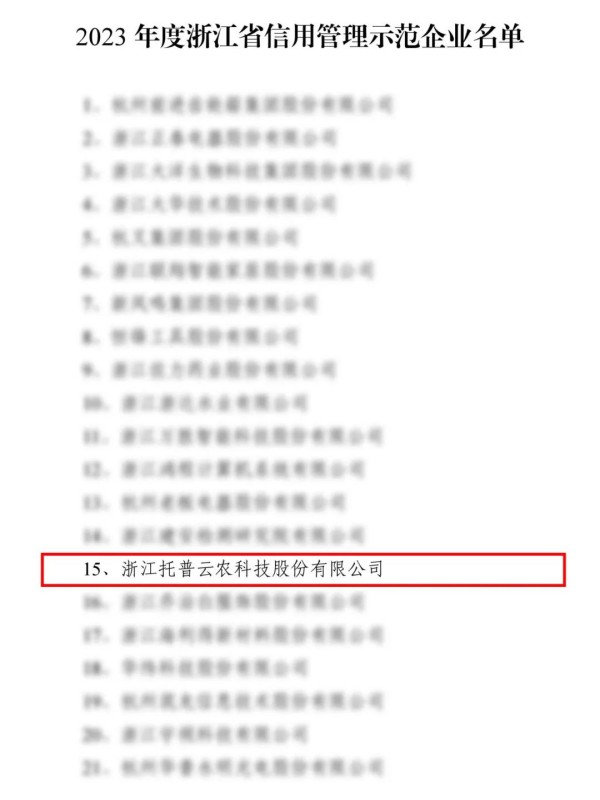 近日,浙江省市場(chǎng)監(jiān)督管理局公布《2023年度浙江省信用管理示范企業(yè)名單》,浙江托普云農(nóng)科技股份有限公司(以下簡(jiǎn)稱“托普云農(nóng)”)榮譽(yù)入選。